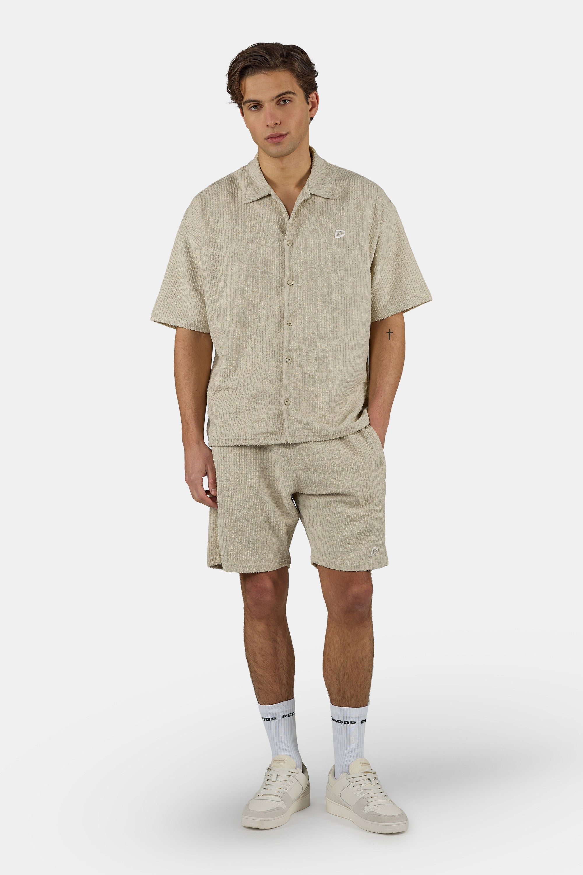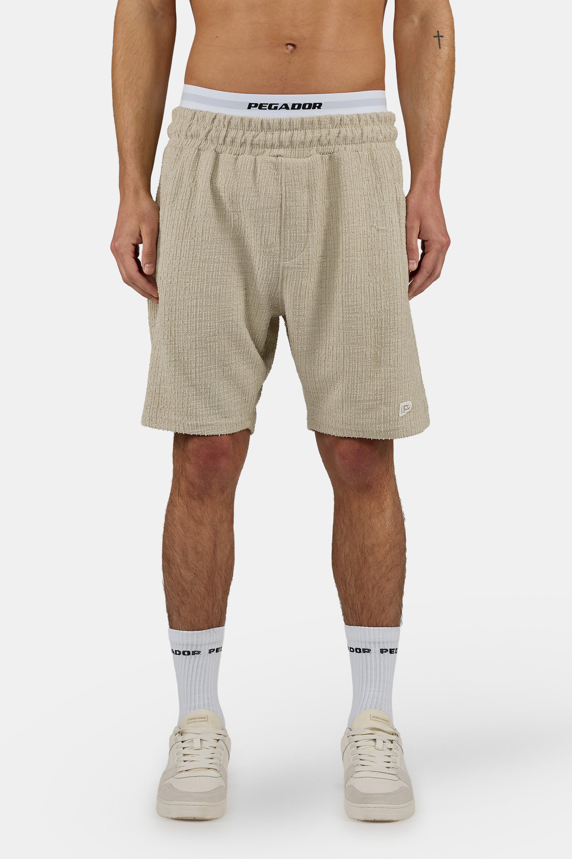 - khaki beige structured knit shorts